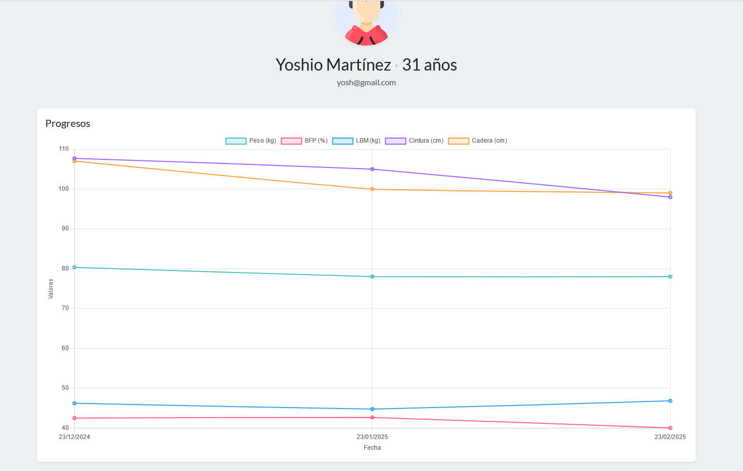 - Gráficas de progreso para visualizar avances en peso, medidas y metas.