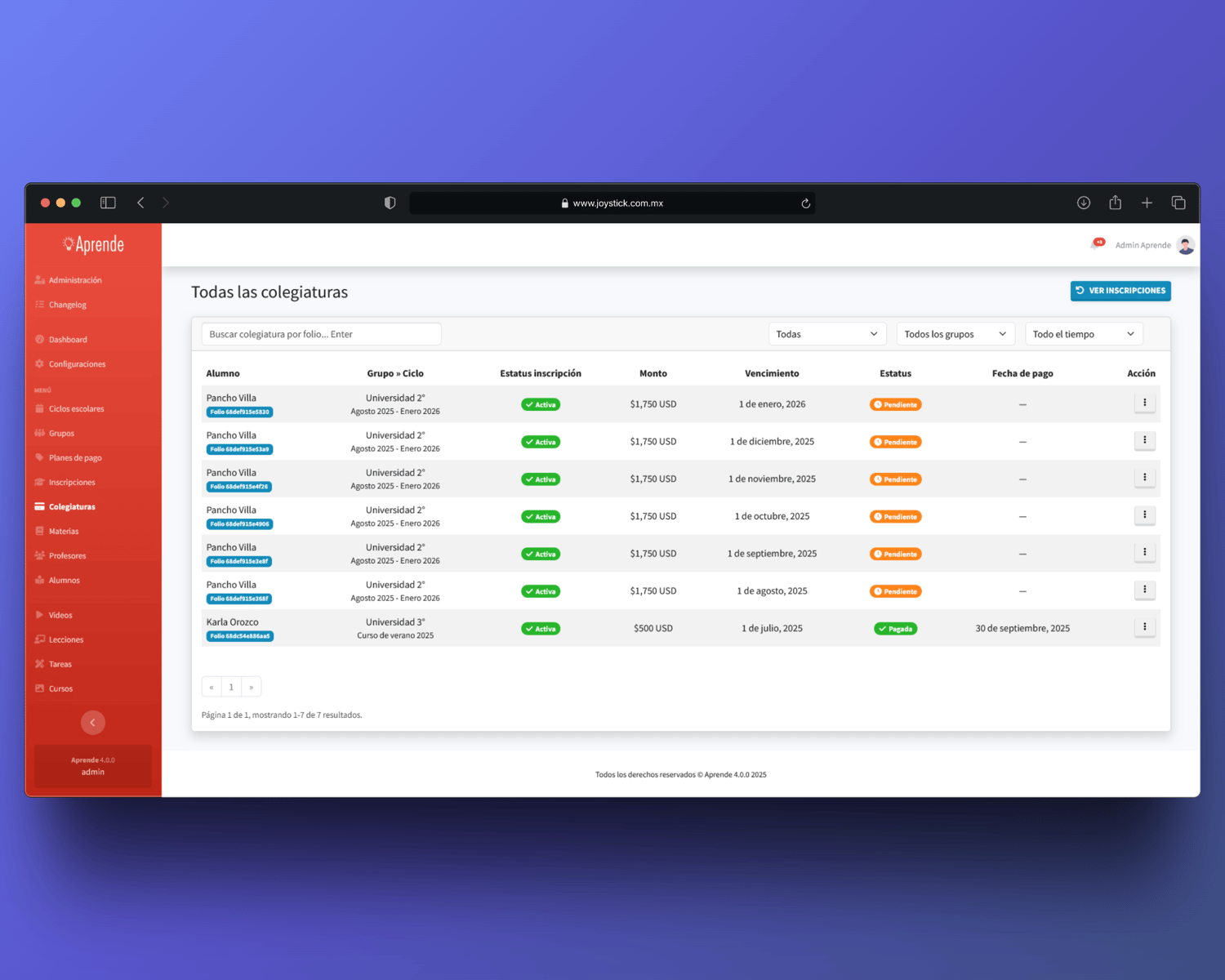 - 🧾 Inscripciones a cursos o grupos y control de colegiaturas.